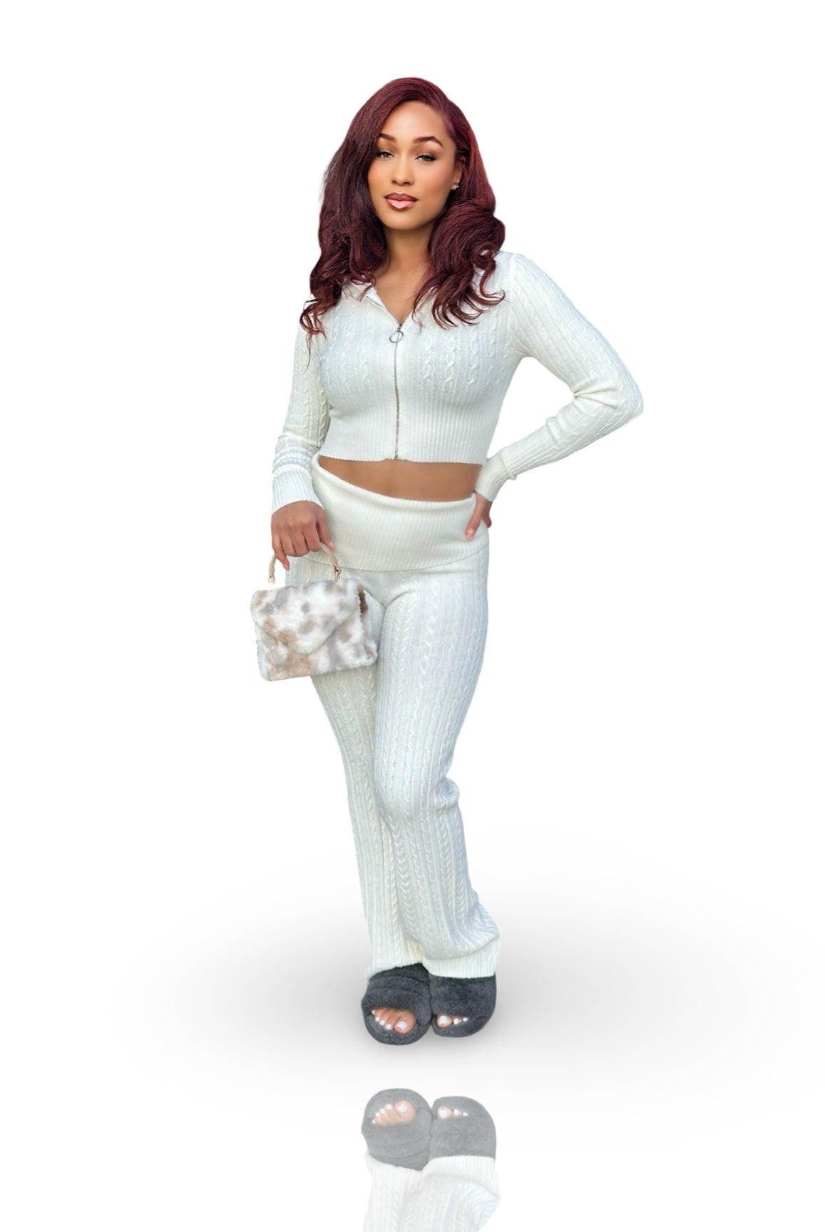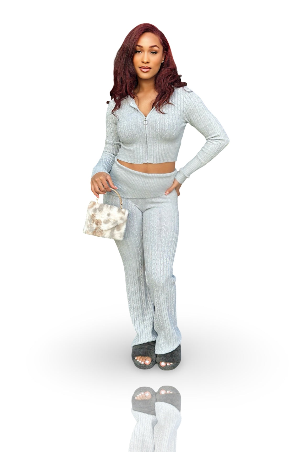 Easily Adored” is your go-to set for the baddie who’s booked, busy, and still chill. Featuring a curve-loving cable knit texture, this two-piece set includes a cropped zip-up hoodie and matching high-rise pants that hug you in all the right places.