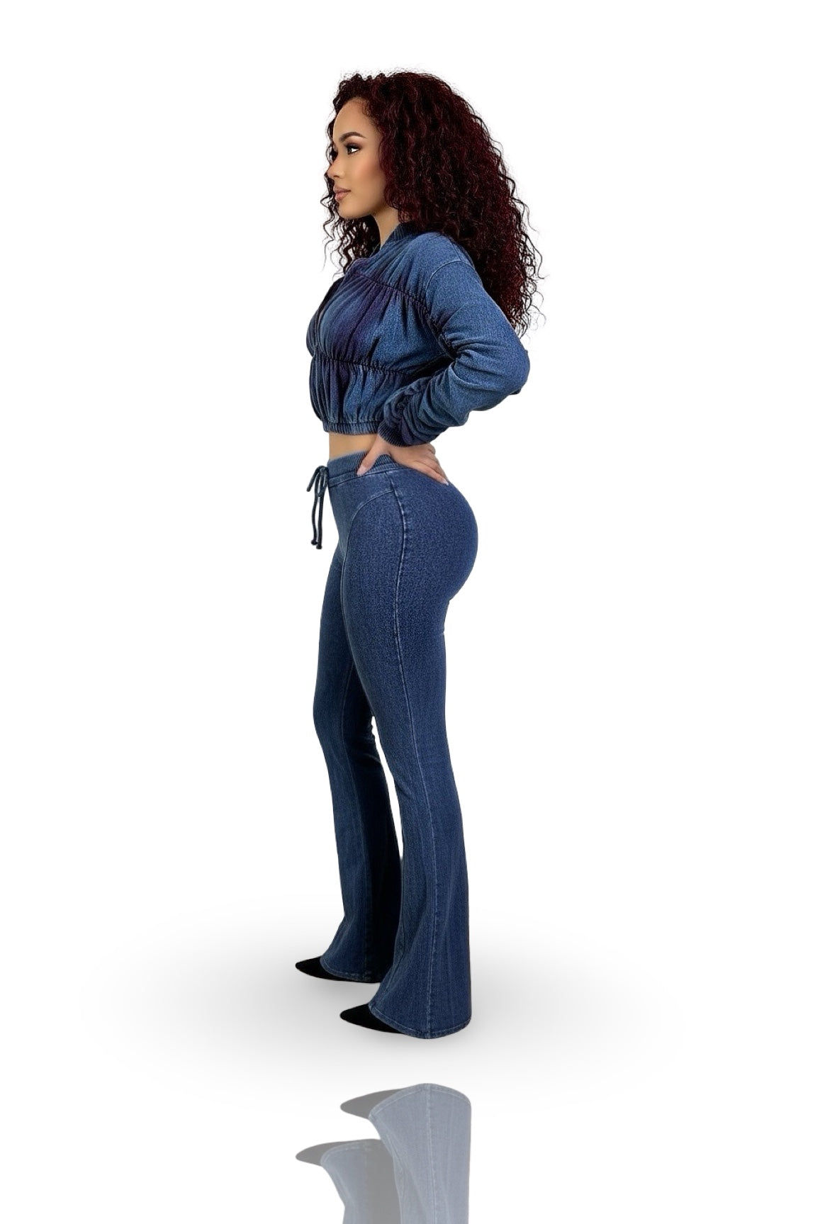 Solo Mission - Mineral Wash Zip-Up Shirred Crop Jacket & Flare Pants Set