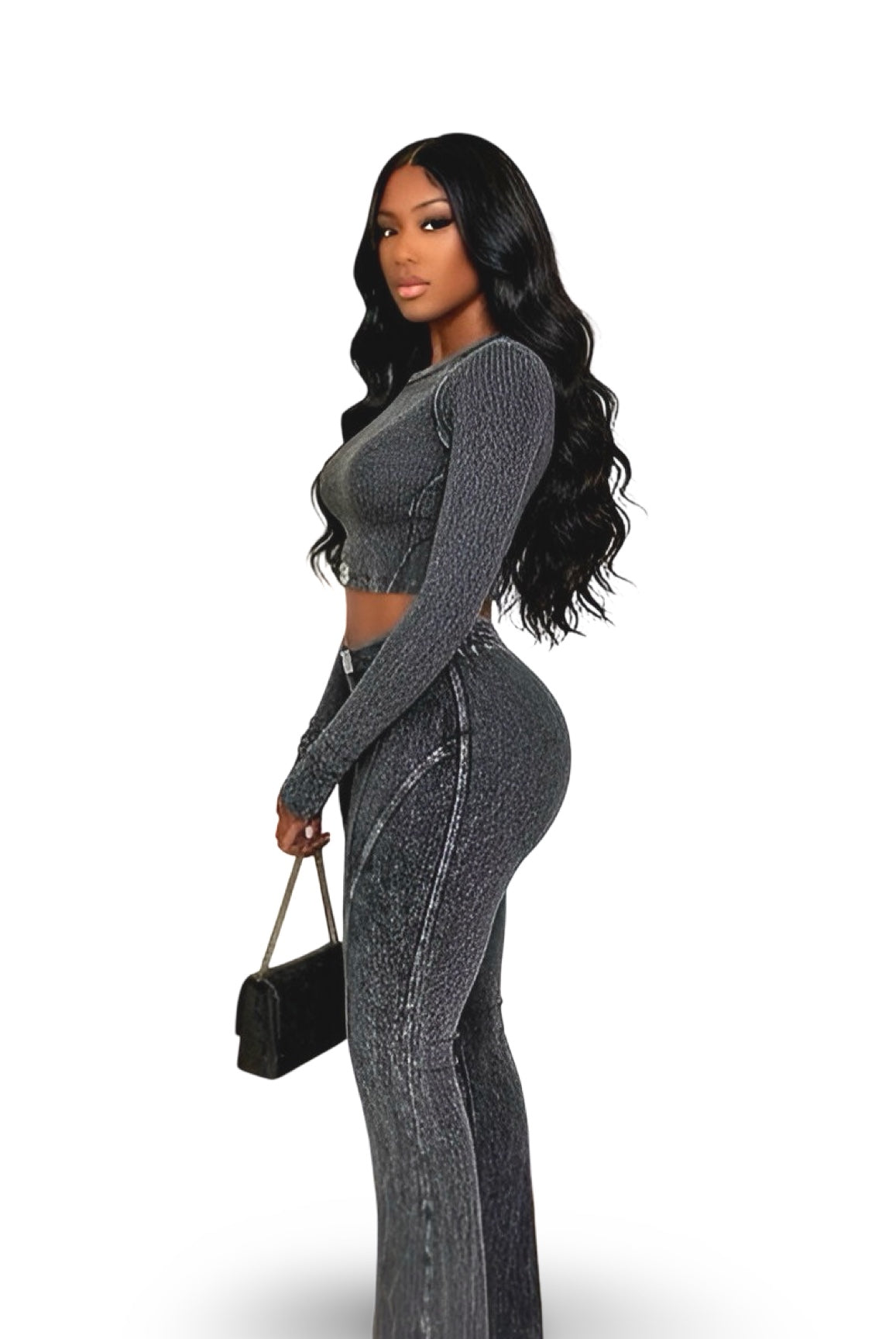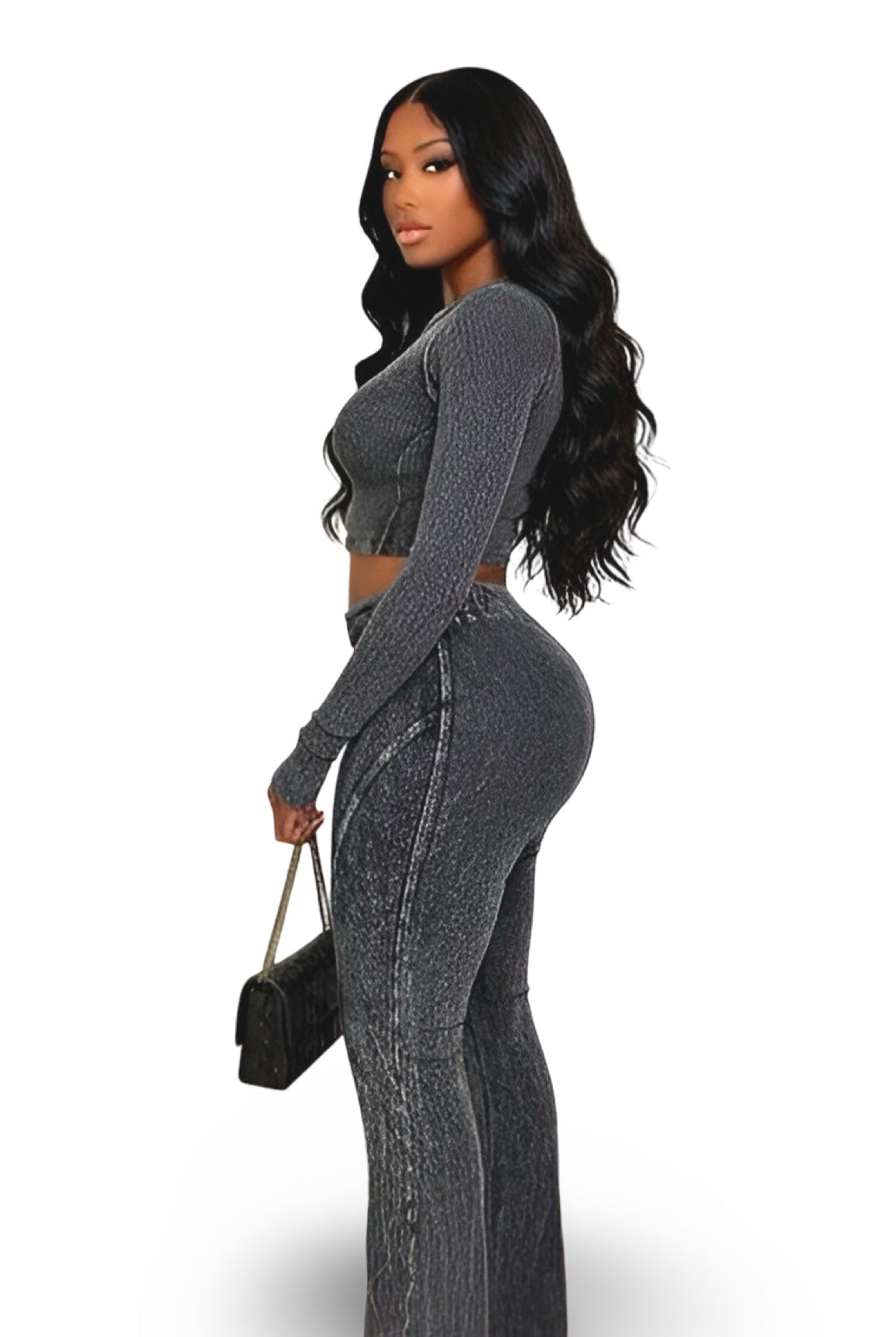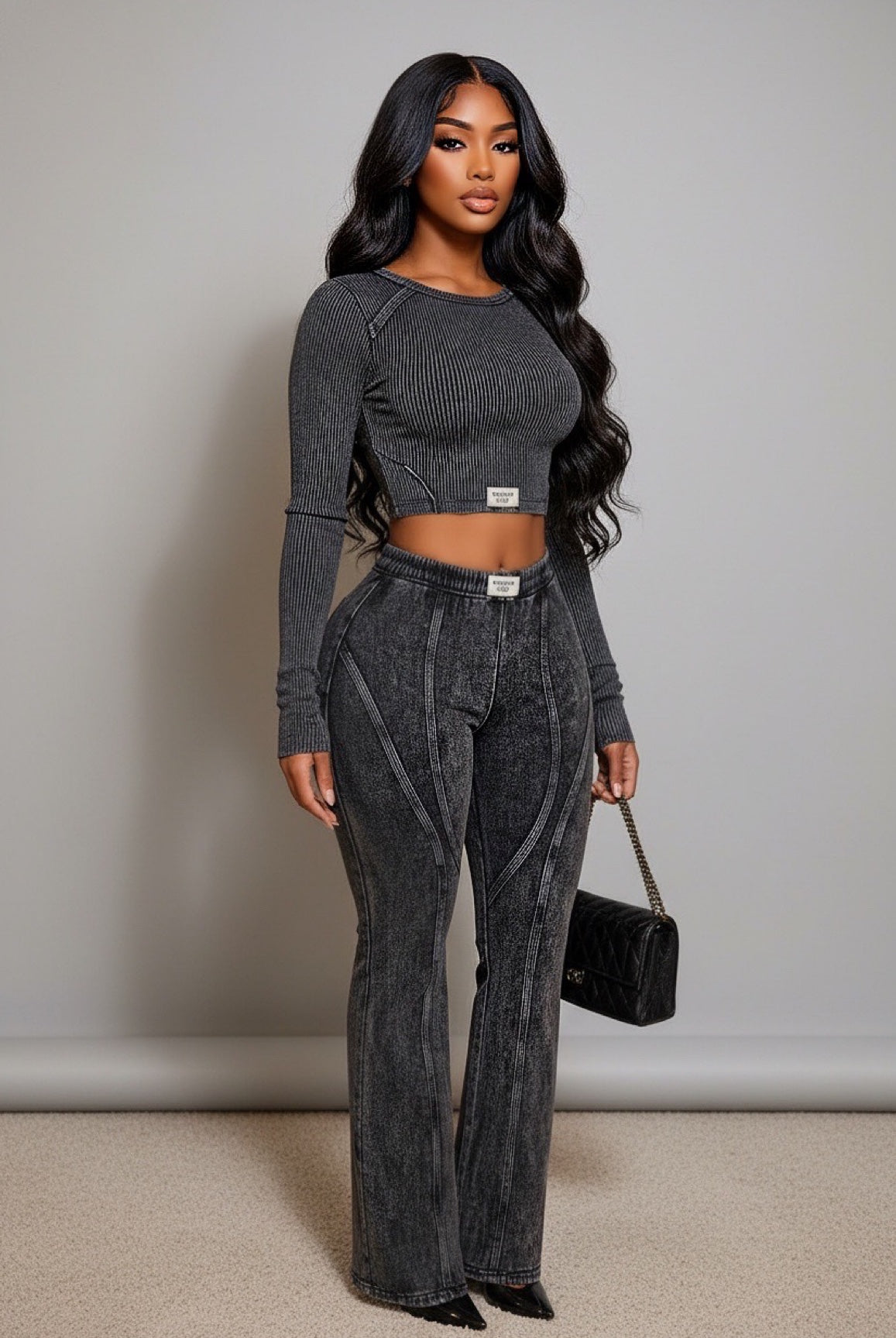 Turn casual days into main character moments with this Ribbed Two-Piece Set — the perfect mix of streetwear and sleek. The fitted long-sleeve crop top hugs your curves in all the right places, while the matching high-waisted flared pants sculpt your shape with contour seams that highlight every angle. The washed black finish adds an effortlessly edgy vibe that’s perfect for both day and night looks.